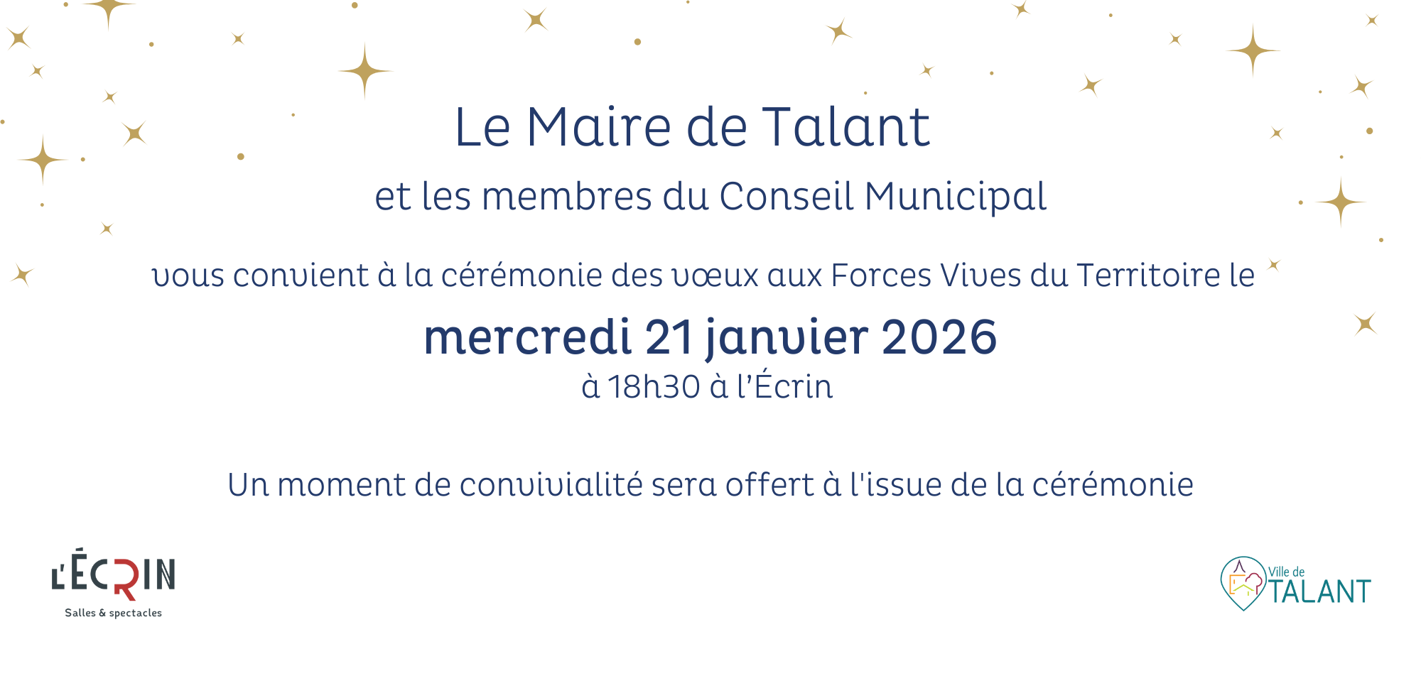Le Maire de Talant et l’ensemble des membres du Conseil Municipal vous convient à la cérémonie des vœux aux Forces Vives du Territoire :