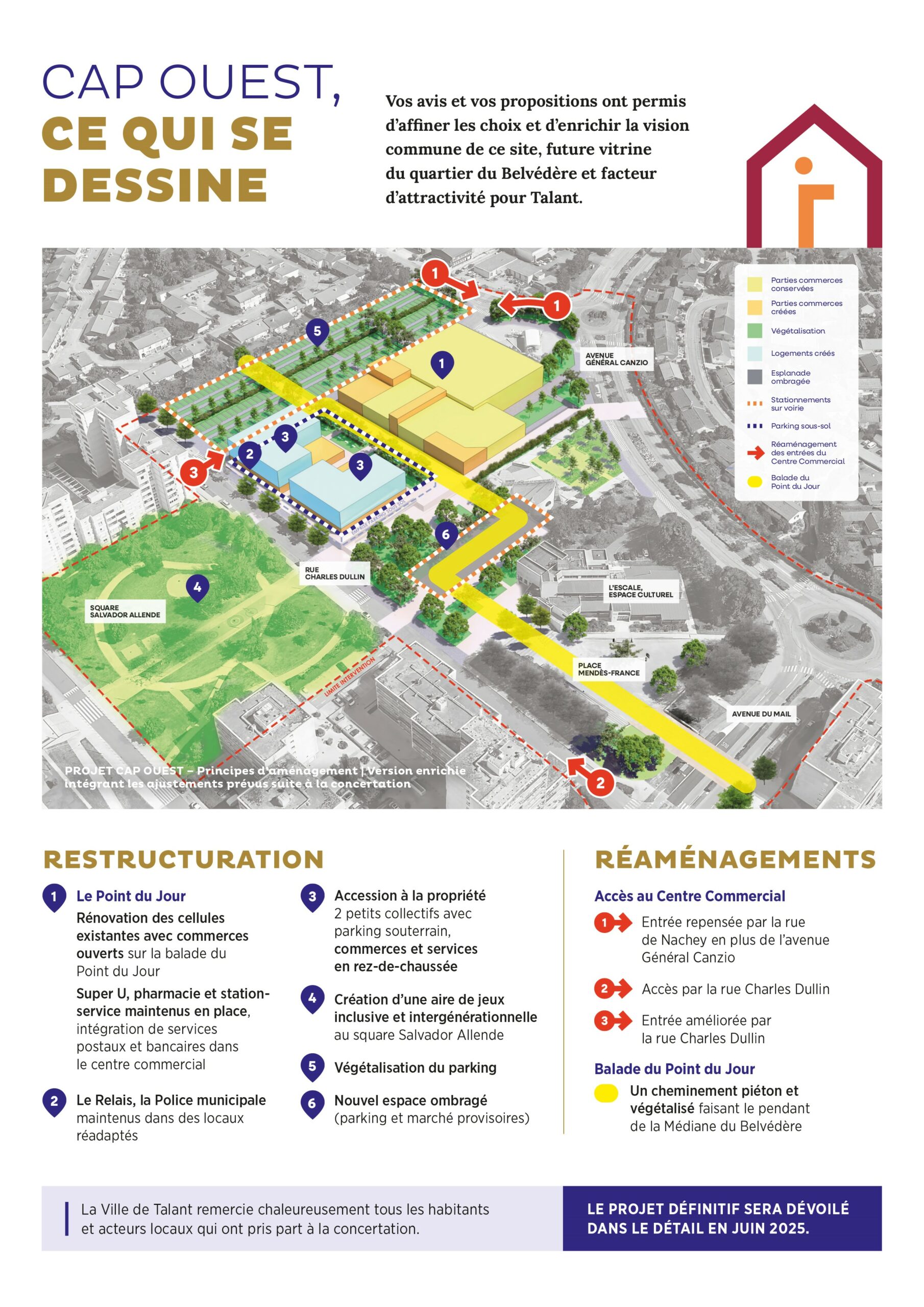Au travers de la concertation publique d’une durée exemplaire de 6 mois, les Talantais ont exprimé un vif intérêt et ont largement salué l’ambition de la Ville pour la restructuration du Centre commercial du Point du Jour avec le réaménagement de son environnement qui intègre l’Esplanade Michèle Soyer, la place Mendès-France, L’ESCALE Espace Culturel et le square Salvador Allende.