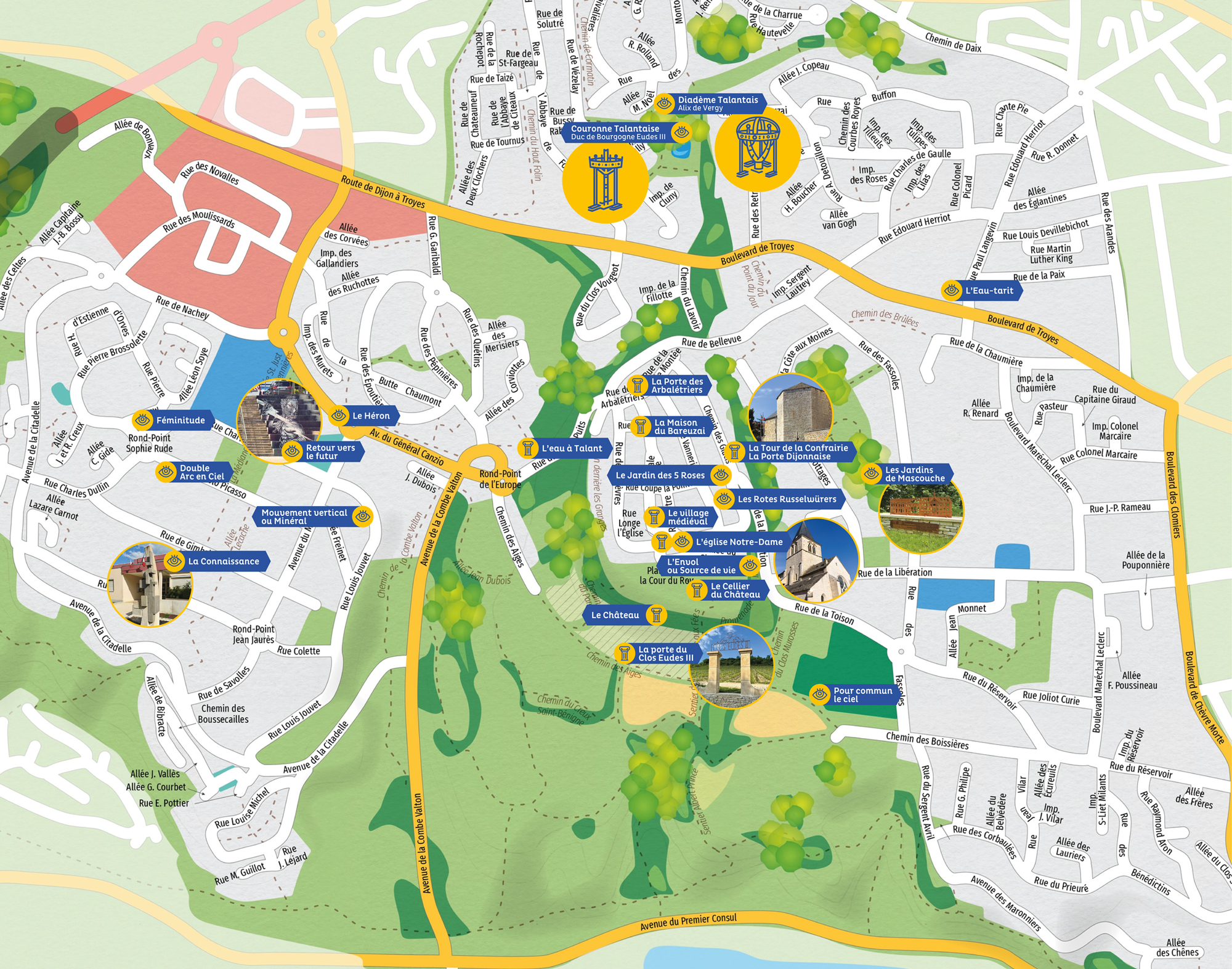 – D’une double sculpture sur bois au square des Montoillots, figurant une couronne et un diadème en hommage aux fondateurs de Talant, le Duc de Bourgogne Eudes III et son épouse Alix de Vergy.