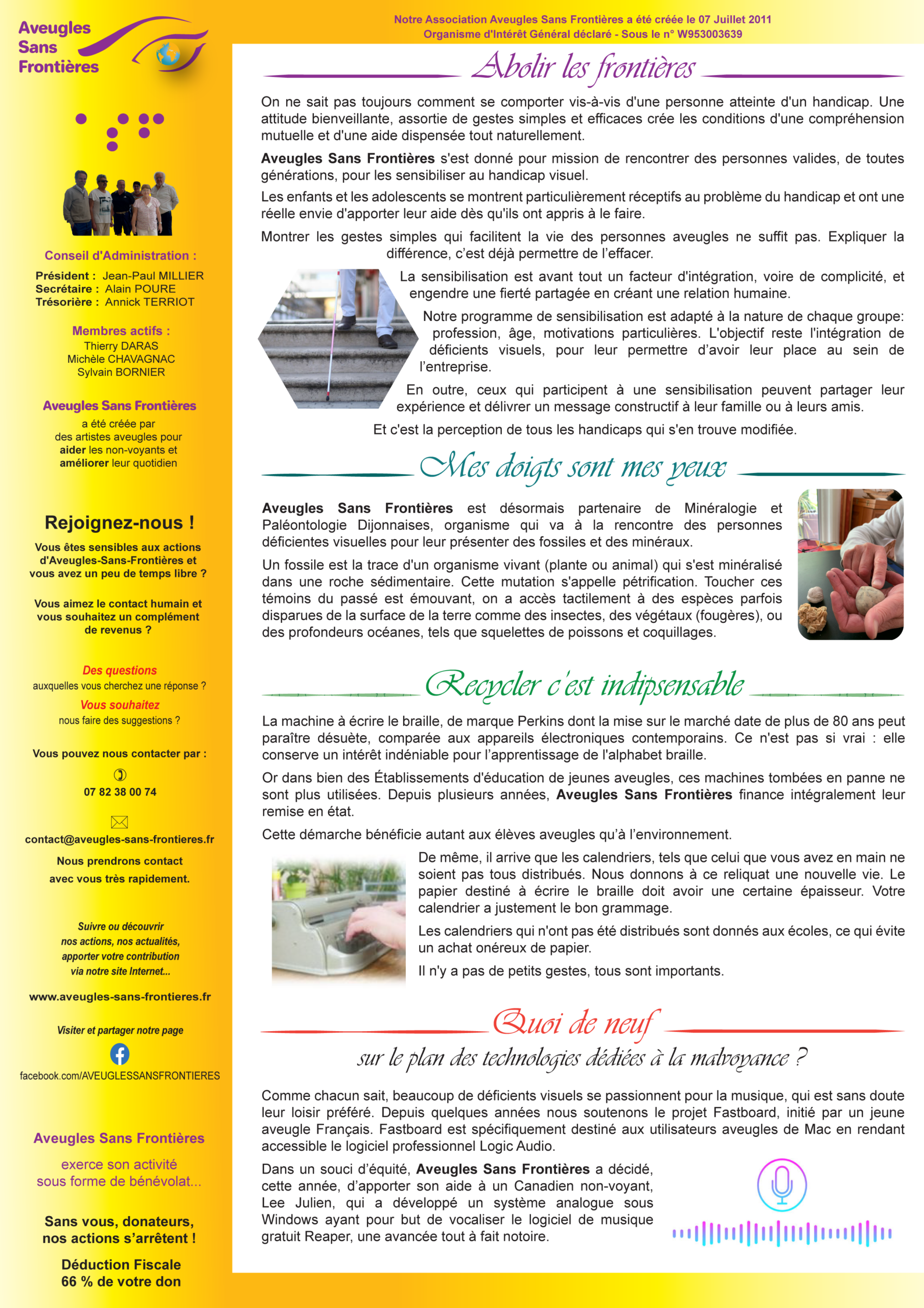 Chaque année l’Association Aveugles Sans Frontière édite un calendrier où sont reprises les principales actions de l’année écoulée.