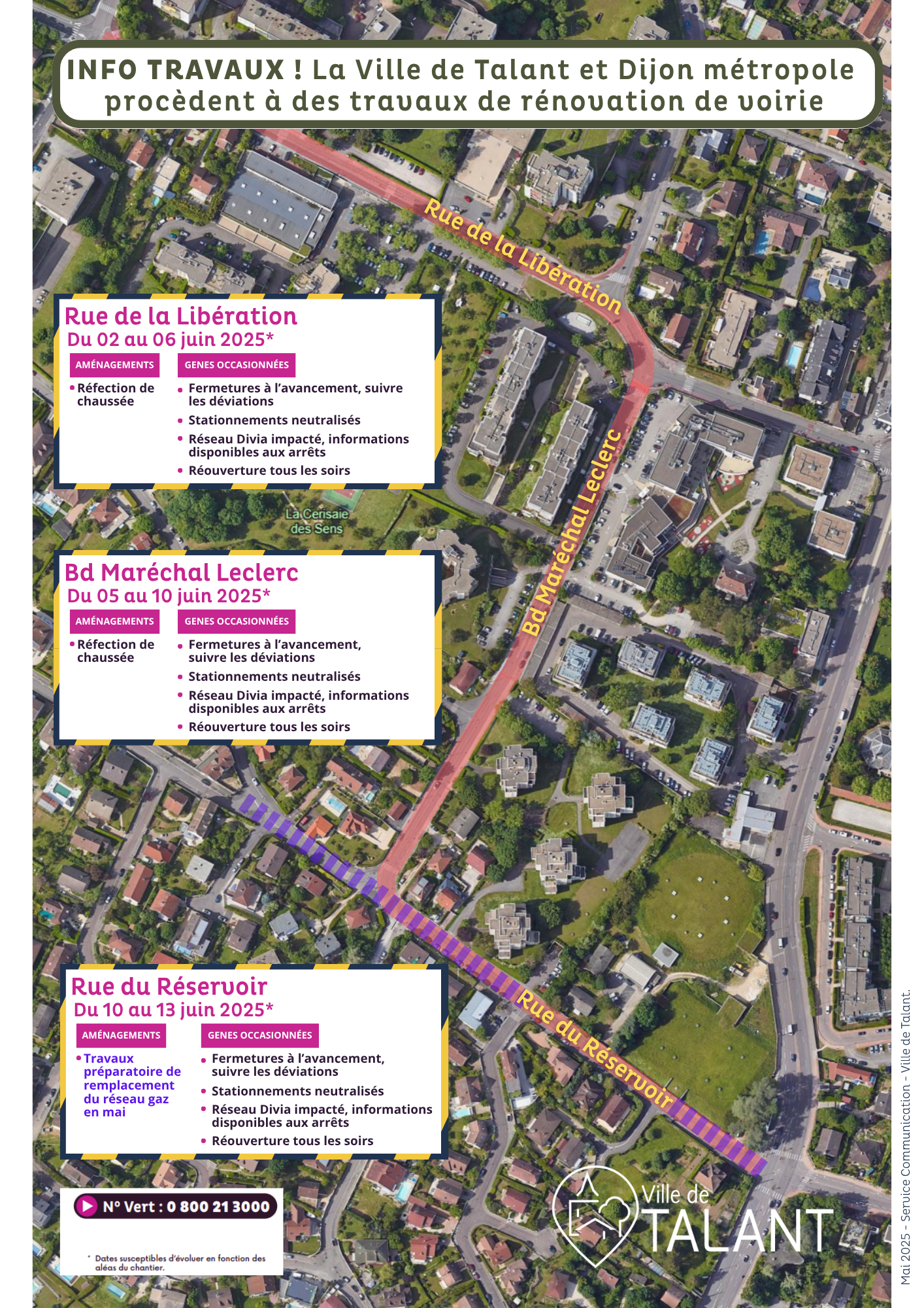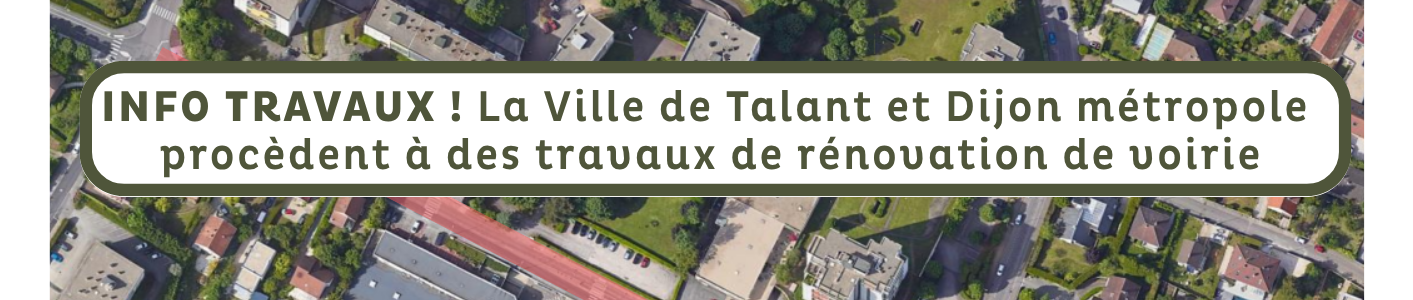 A partir du 02 juin 2025, la Ville de Talant et Dijon métropole procèdent à des travaux de rénovation de voirie (réfection de chaussées) dans le quartier des Cerisiers.