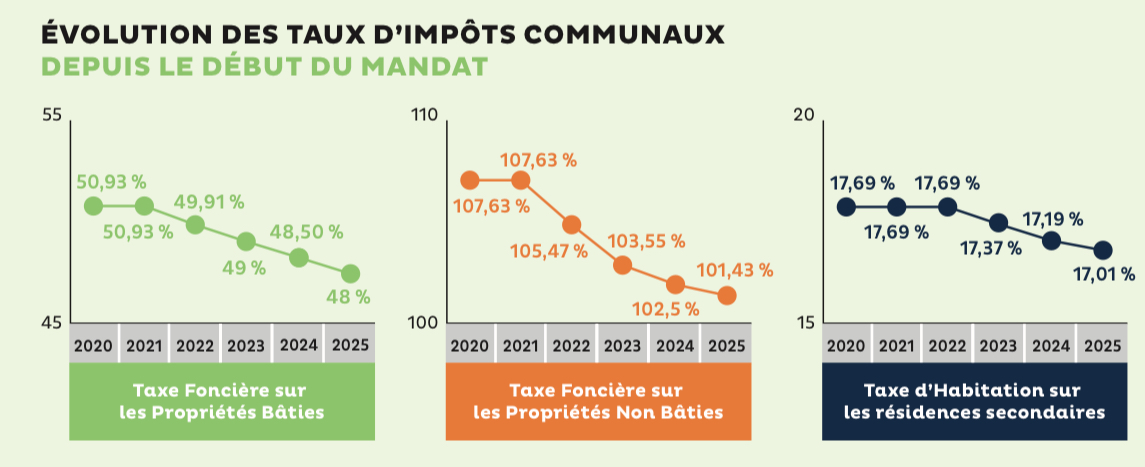 C’est la quatrième fois consécutive que les taux d’impôts communaux baissent dans notre ville après les diminutions de 2% en 2022, de 1,82 % en 2023 et de 1 % en 2024.