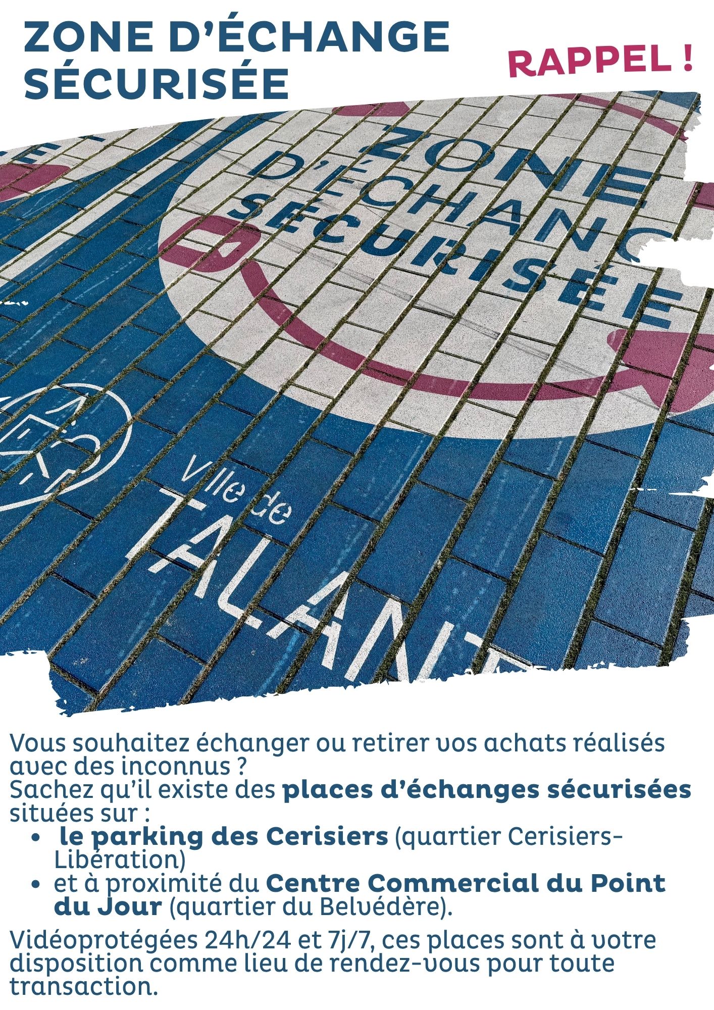 Vidéoprotégées 24h/24 et 7j/7, ces places sont à votre disposition comme lieu de rendez-vous pour toute transaction.