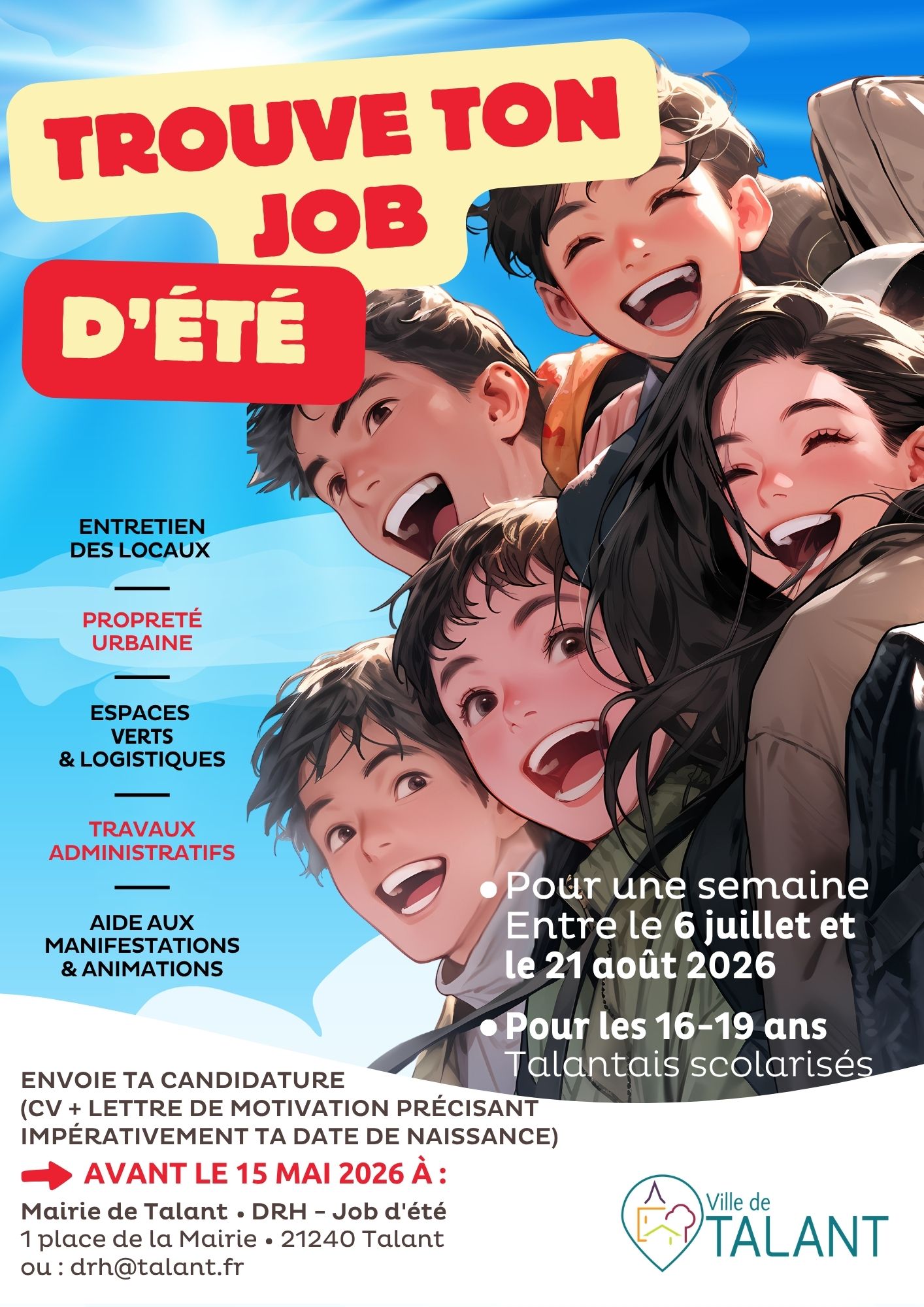 Adresse ta candidature (CV + lettre de motivation précisant impérativement ta date de naissance) avant le 15 mai à : Mairie de Talant / DRH – Job d’été / 1 place de la Mairie 21240 TALANT ou par mail à drh@talant.fr