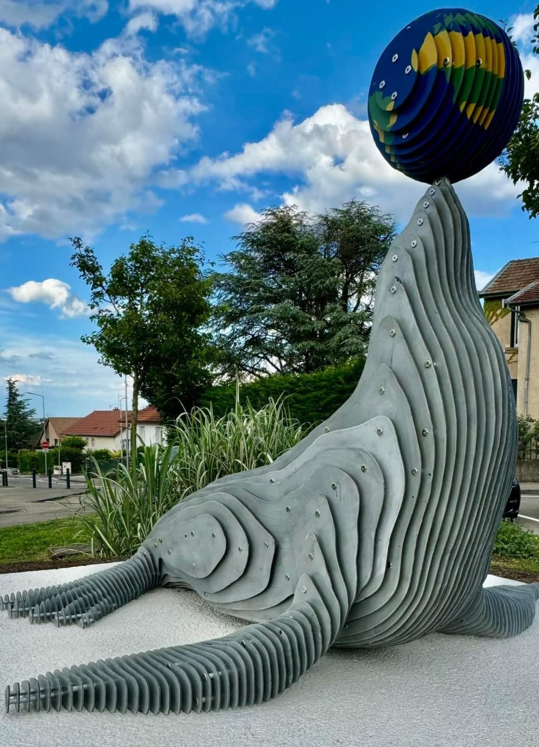 Cette œuvre nous invite à nous questionner sur le manque d’eau, les répercussions de nos consommations et les changements climatiques. Elle est réalisée entièrement de matériaux recyclés. Au bout de son museau, la planète Terre ! On en a qu’une, il faut en prendre soin.