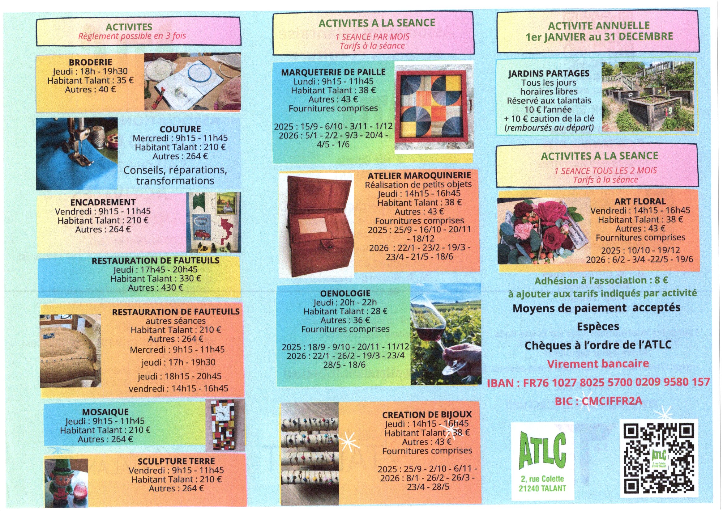 Les inscriptions se font auprès des responsables des activités. Possibilité de régler en 3 fois. Pour le premier versement ajouter 8 € d’adhésion à l’association. Une séance d’essai gratuite est possible uniquement pour ces activités