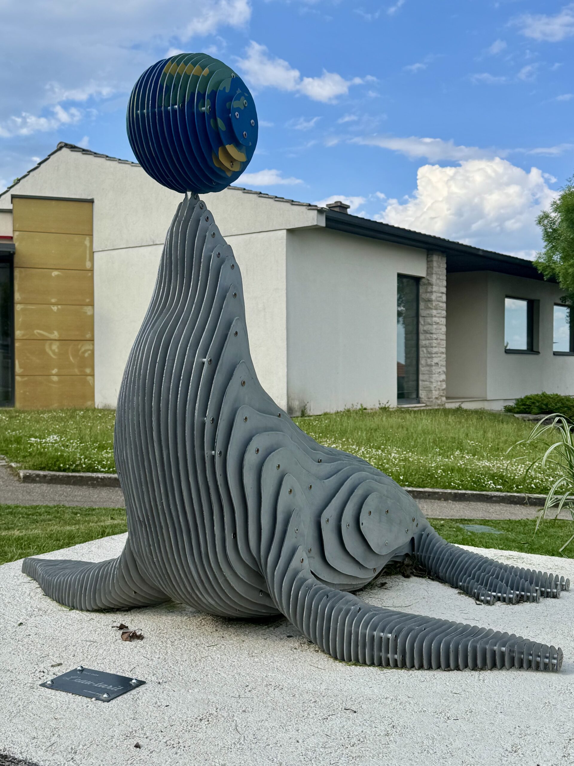 Spécialisées en écoconception, les créations de Vincent Rahir sont respectueuses de l’environnement. En effet, les matériaux utilisés sont recyclés et recyclables, venant d’entreprises locales. Pour l’artiste, cette œuvre doit être un guide pour les jeunes qui seront à l’initiative de solutions face au dérèglement climatique : cette sculpture a pour mission de témoigner de l’importance de la sauvegarde de la biodiversité face à cette problématique. Le mammifère tient en équilibre sur son museau une sphère peinte dont les motifs s’inspirent des croquis des élèves avec lesquels l’artiste a travaillé durant des temps de médiation. Cette sphère représente notre planète, la Terre : planète bleue dont l’eau, sa principale ressource, lui donnant cette couleur si caractéristique, tend à disparaître. Ce qui, à terme, mettra en danger cet animal aquatique au même titre que l’ensemble de la biodiversité mondiale.
