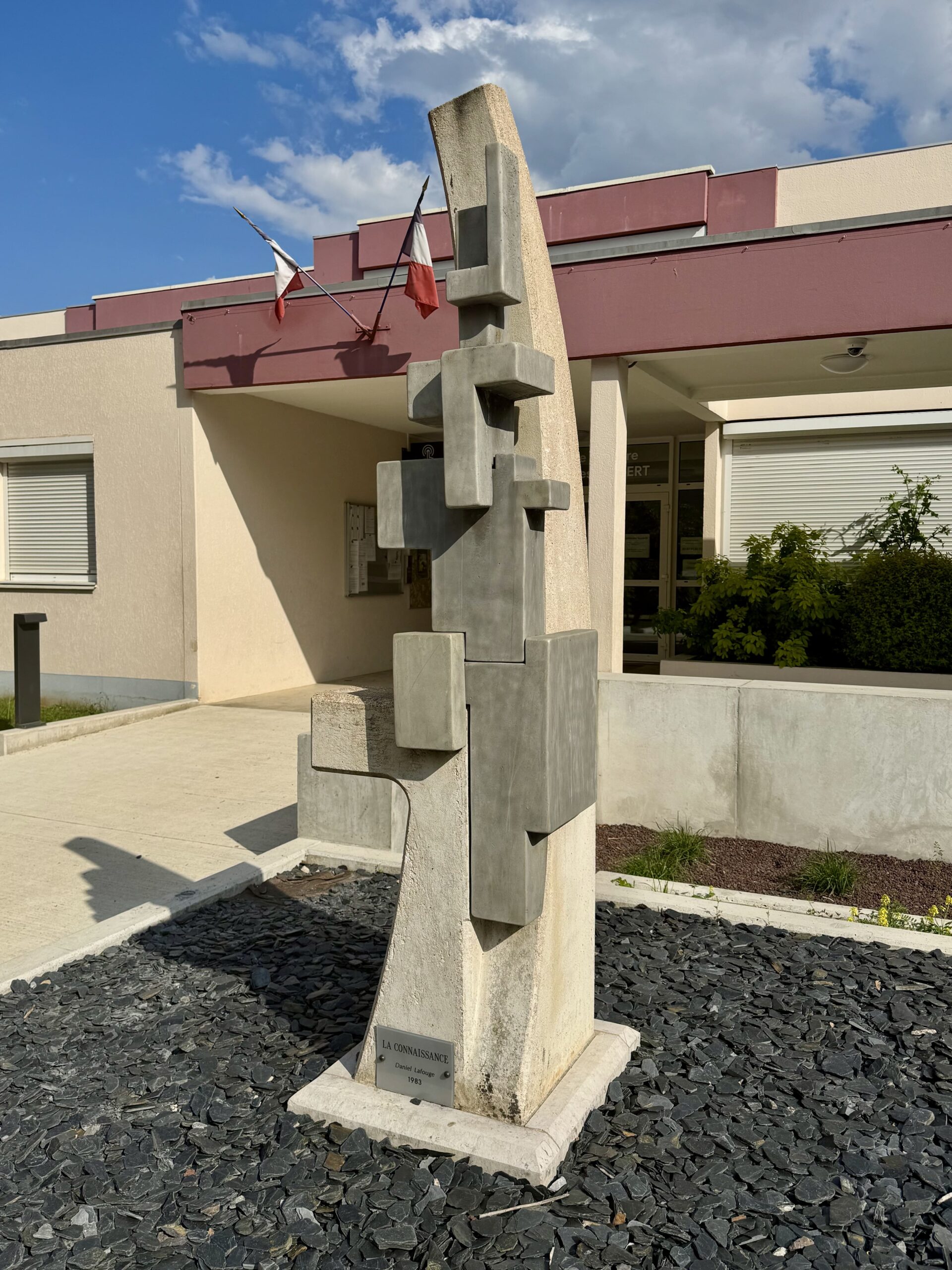 Commande publique dans le cadre du 1% artistique. Réalisée en 1983, La Connaissance est une œuvre monumentale de Daniel Lafouge, sculpteur et plasticien français. Cette sculpture associe un tronc massif en béton clair à un ensemble de blocs géométriques en aluminium, suspendus comme en équilibre précaire. L’artiste y exprime une idée essentielle : si la connaissance prend appui sur des bases solides, elle reste néanmoins fragile et doit être sans cesse entretenue et questionnée. Implantée devant l’École Jacques Prévert de Talant, cette œuvre invite à réfléchir sur la transmission du savoir, sa complexité et sa nécessaire vigilance.