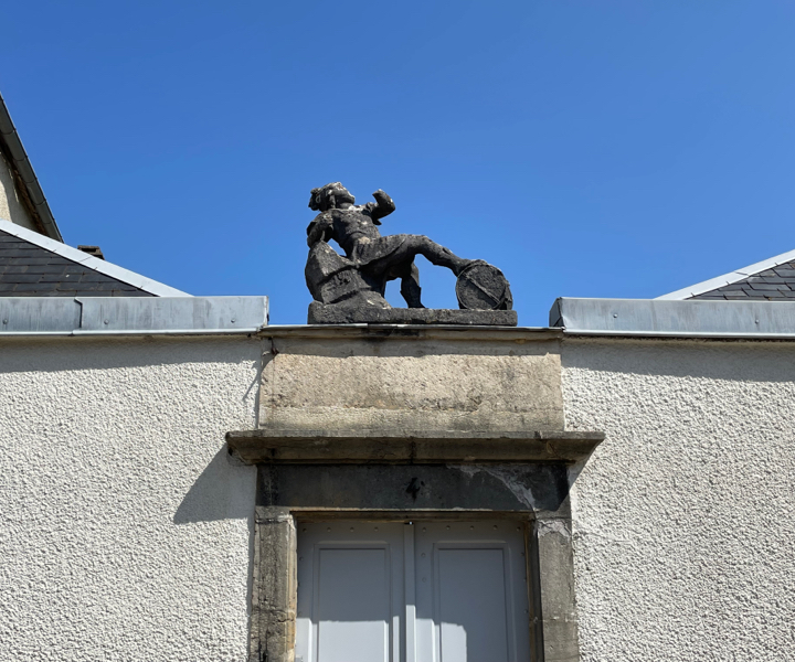 Dont le fronton de la porte de clôture supporte une statue de soldat.