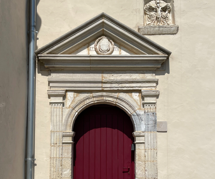 A l’époque médiévale, la rue Notre-Dame (anciennement rue du Mitan) formait une place au centre de laquelle une croix était érigée. Les jours de marché, artisans et commerçants installaient leurs étals au pied des maisons et contre le mur nord de l'église. Aujourd’hui, au 30 de la rue Notre-Dame, une maison est ornée d'une porte Renaissance (1560) : deux pilastres cannelés supportent un fronton triangulaire. Une niche abrite une Sainte Trinité (1613) : Dieu le Père soutient la croix de ses deux mains écartées, tandis que la colombe du Saint-Esprit vole au-dessus de la tête du Christ.