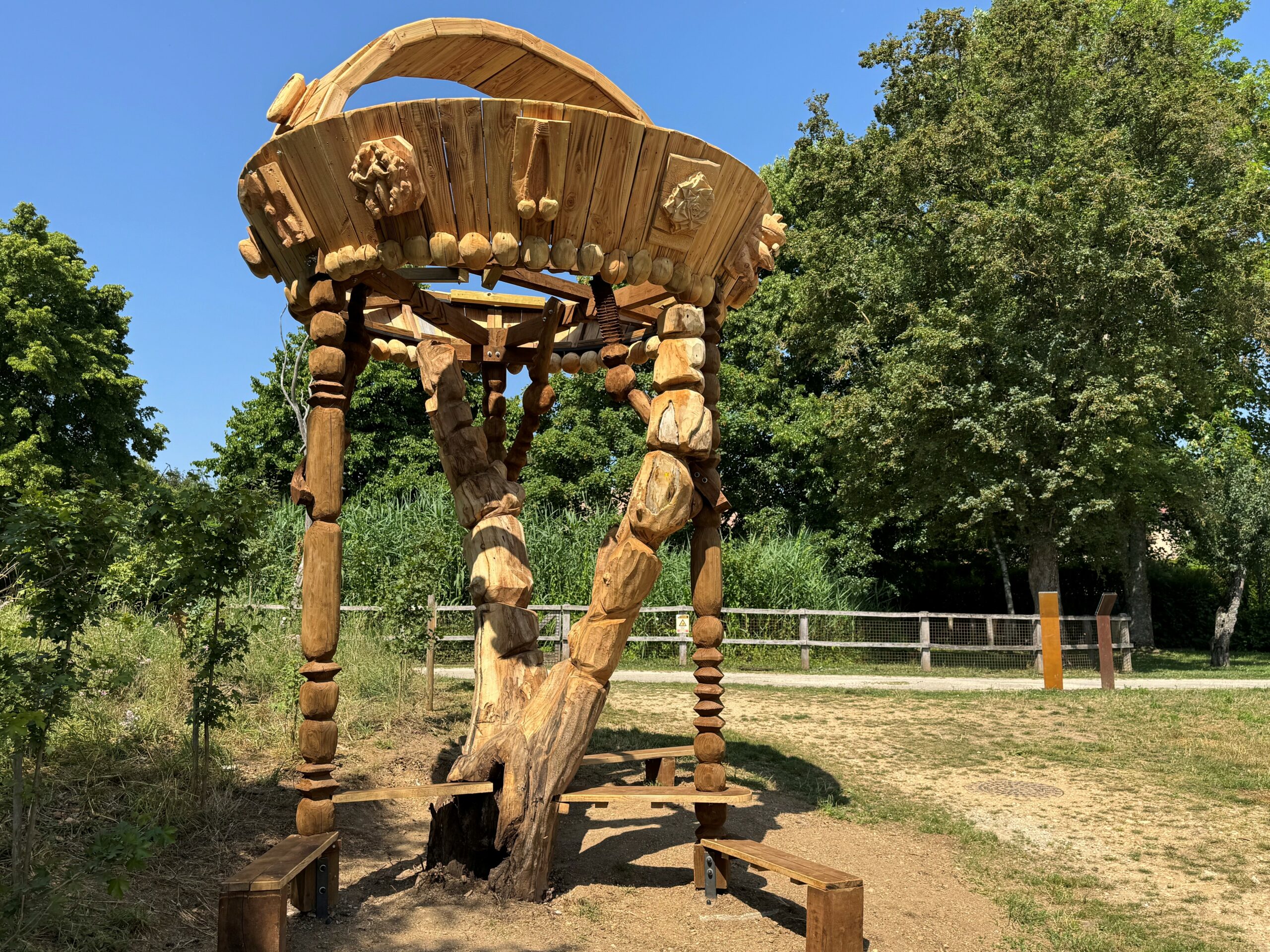 Le diadème sur noyer rend hommage à Alix de Vergy, épouse influente du Duc de Bourgogne Eudes III. Alix, issue de la noble famille de Vergy, joua un rôle clé dans l'administration et la stabilité du duché après la mort d'Eudes III en 1218 jusqu'à la majorité de leur fils, Hugues IV. Le diadème contemporain, conçu comme une architecture pérenne, inspiré d’éléments historiques existants, s'intègre harmonieusement à l'environnement naturel de Talant. Installé en hauteur, il est accompagné d'un mobilier urbain en bois, créant un espace convivial où les habitants peuvent se retrouver et interagir. Ce diadème symbolise à la fois l'histoire locale et l'engagement des artistes à réinventer le patrimoine à travers une création contemporaine.