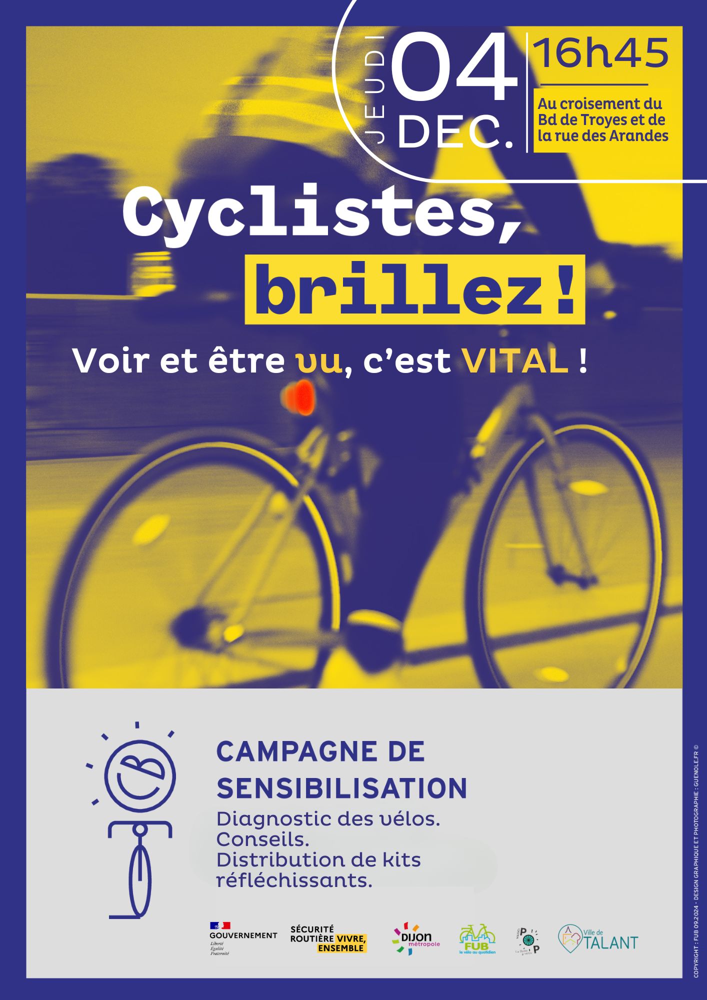 Avec le changement de saison, la nuit tombe de plus en plus tôt. Il est primordial de se rendre visible à vélo pour assurer sa propre sécurité, mais également pour protéger les autres usagers de la route. Dans le cadre de cette campagne soutenue par la Direction à la Sécurité Routière, les associations du réseau FUB proposent des actions de sensibilisation sur l’importance de l’éclairage à vélo : diagnostic des vélos et conseils aux cyclistes distribution de kits réfléchissants, de kits d’éclairage comptage de cyclistes…