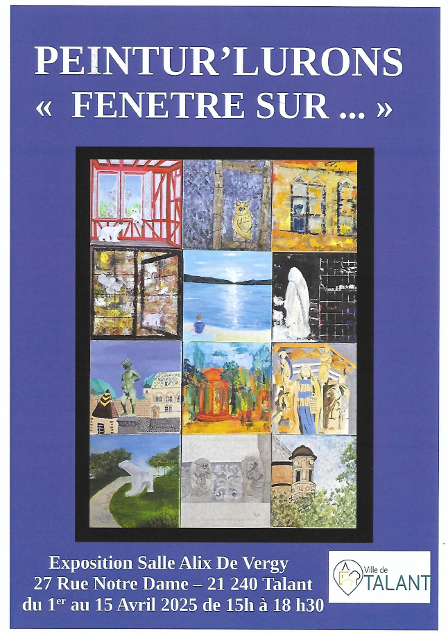 Exposition annuelle des Peinturlurons du 1er au 15 avril 2025 à la salle Alix de Vergy à Talant de 15 h à 18 h 30 sur le thème »Fenêtre sur… » . Une quarantaine de toiles seront exposées par 12 artistes.