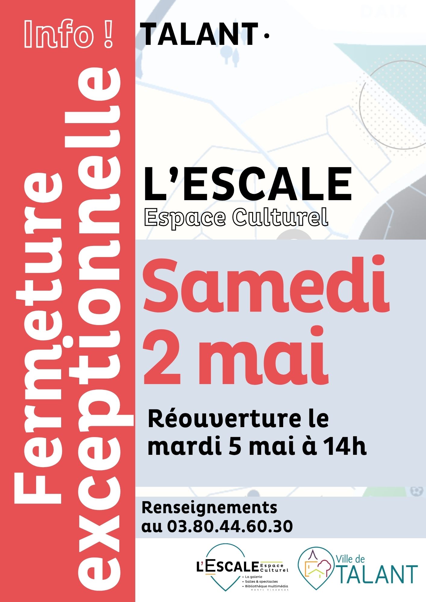 Fermeture de L’ESCALE Espace Culturel de 10h à 12h30.