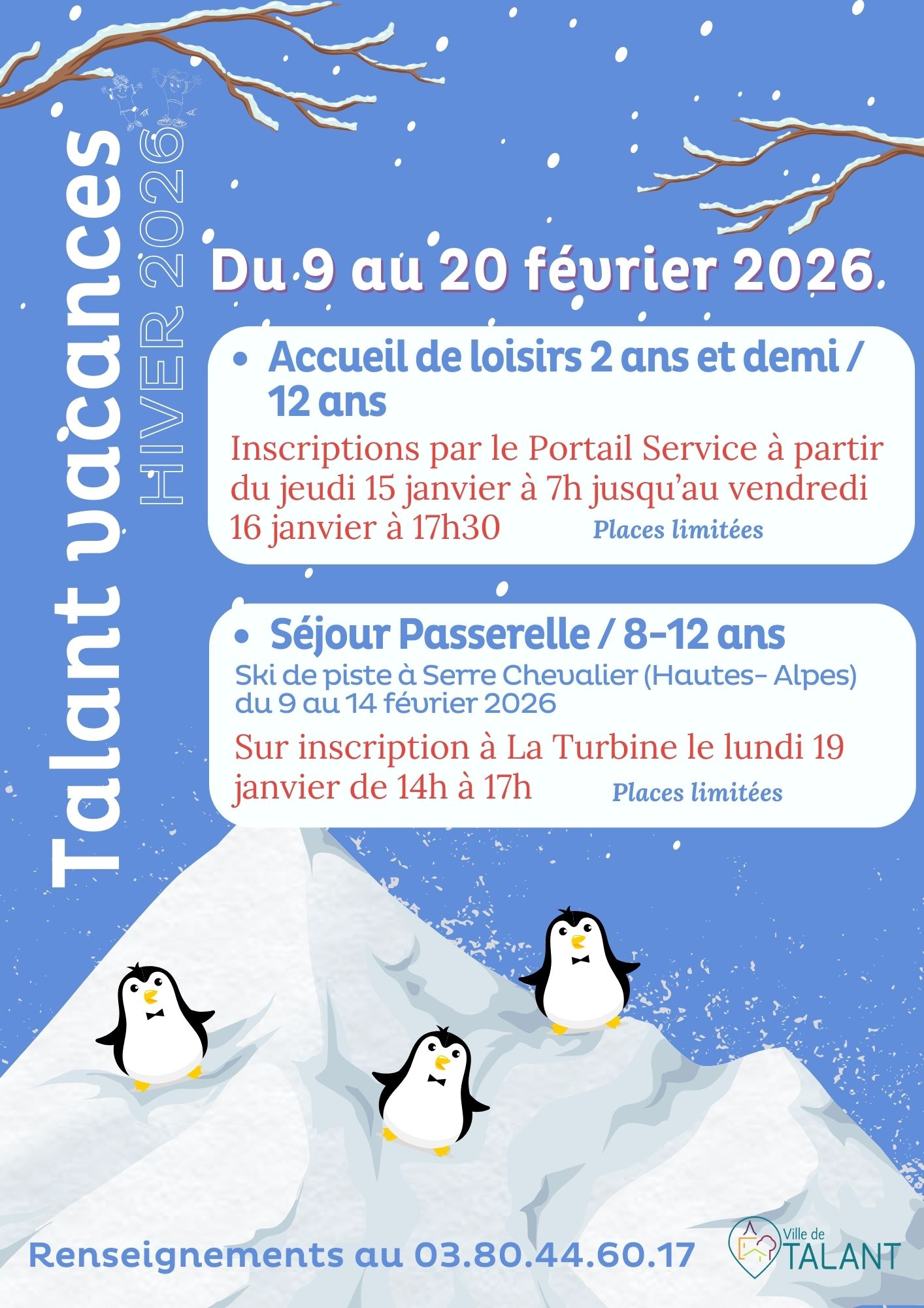 - Séjour Passerelle pour les 8-12 ans : ski de piste à Serre Chevalier (Hautes-Alpes) du 9 au 14 février 2026. Sur inscription à La Turbine le lundi 19 janvier de 14h à 17h. Places limitées.